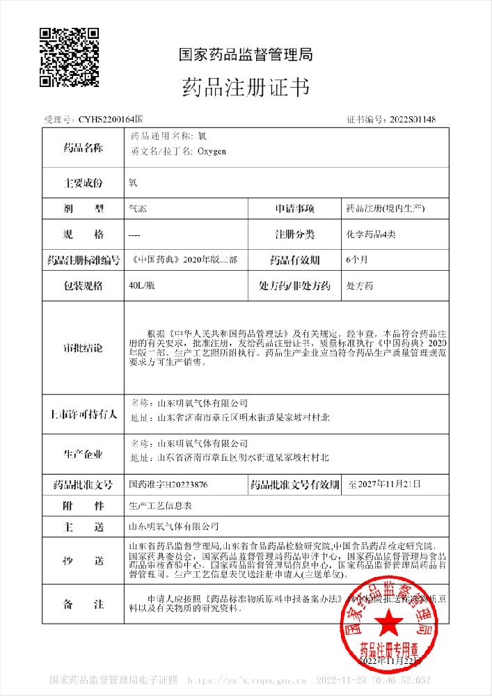 2022年12月取得國家藥品監督管理局頒的藥品注冊證書,醫用氧項目正式投入生產